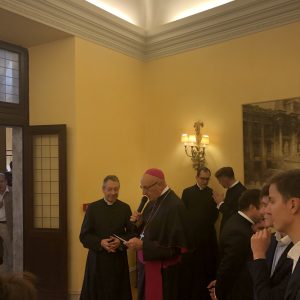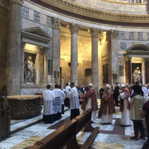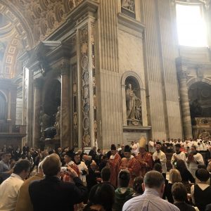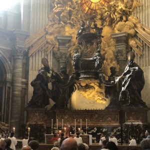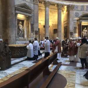 Les célébrations étaient riches et ferventes. Outre la messe célébrée le vendredi après-midi à l’église du Panthéon, il y eut évidemment la grande célébration à la la chaire de Saint-Pierre, dans la grande basilique romaine. On pouvait y dénombrer plus cinq cent personnes, dont près d’une centaine de clercs. On notera l’appel de Mgr Rey à poursuivre le travail pour la liturgie dans un monde en crise où Dieu semble absent. La liturgie est justement appelée à jouer un rôle dans l’évangélisation de nos contemporains.