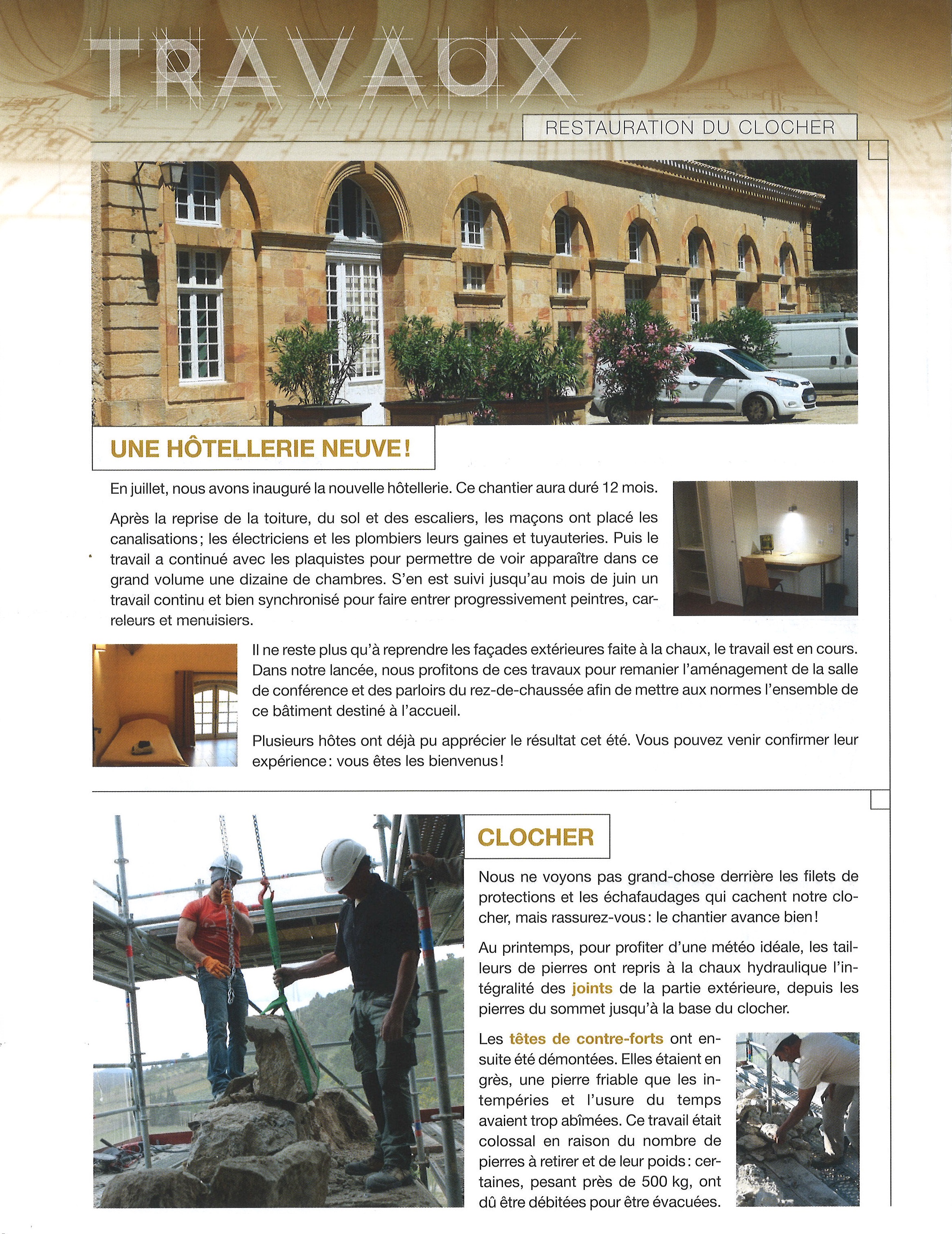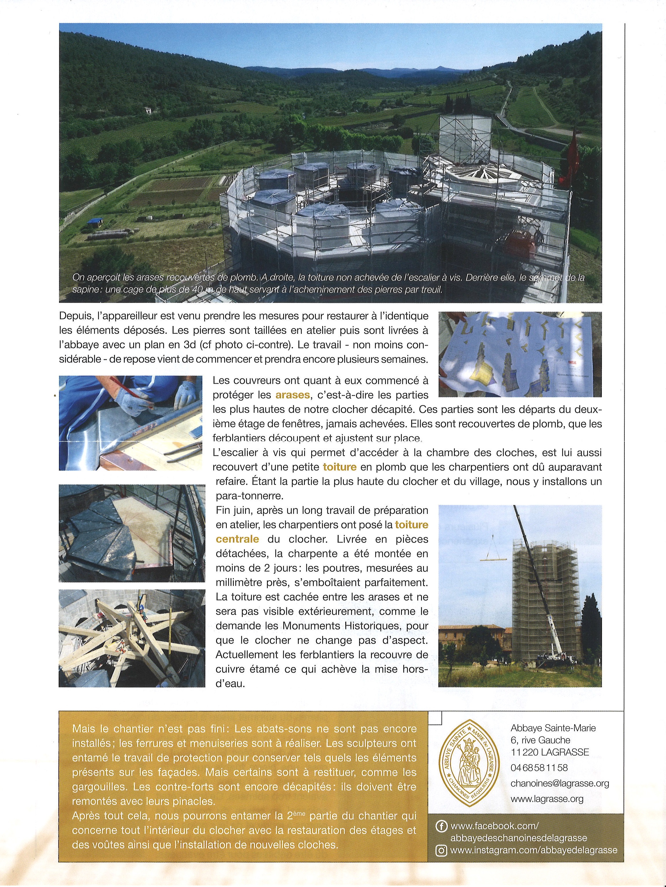 L’Abbaye de Lagrasse poursuit ses travaux… alors que le clocher est en restauration depuis quelques mois, les chanoines vont entreprendre un très gros chantier… celui de l’église abbatiale. Mgr Emmanuel-Marie, abbé de Lagrasse, précise : « Nous comprenons l’enjeu ! C’est celui de notre propre sainteté et du signe que nous offrons. Nous voulons que cette abbatiale restaurée se présente belle, accueillante, vrai lieu de paix pour les fidèles et visiteurs toujours plus nombreux. Or, cette beauté, cette paix, cet accueil doivent venir du fond de nos coeurs. Ce « relèvement » doit être signe de persévérance dans la charité, de courage dans les labeurs ; il se veut témoin de joie et d’espérance« .