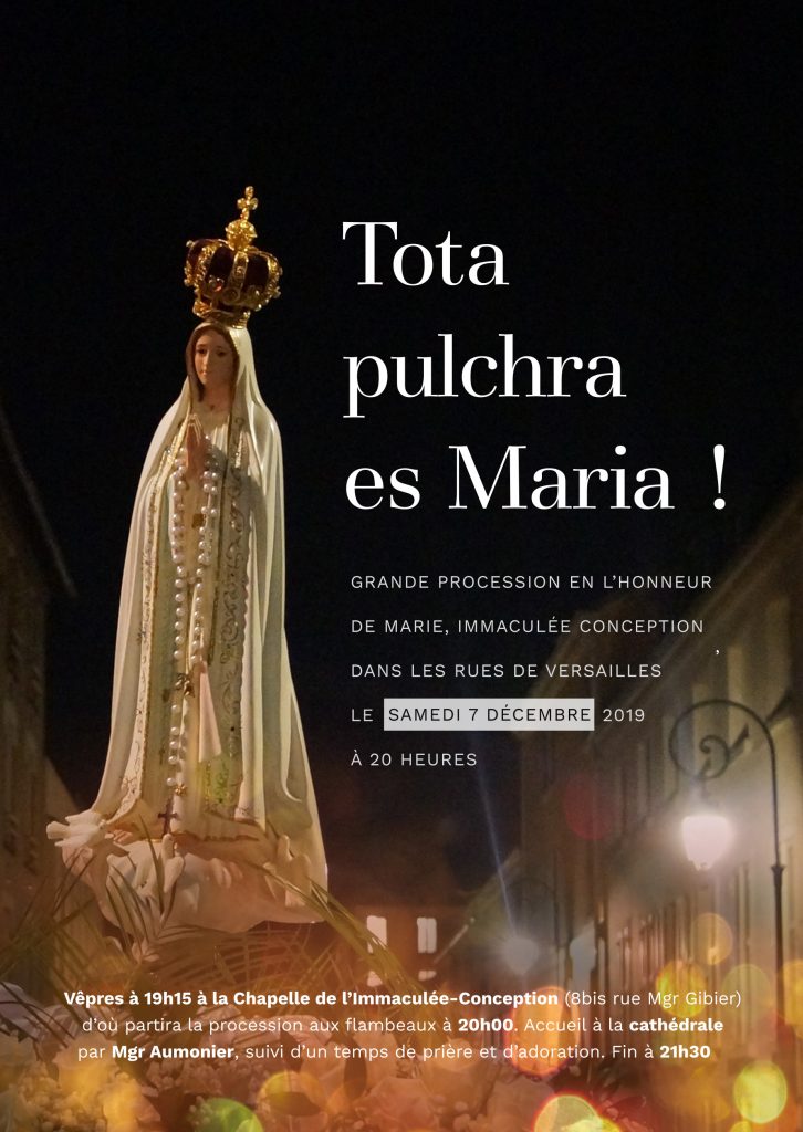 Le samedi 7 décembre aura lieu la traditionnelle procession aux flambeaux, en l’honneur de l’Immaculée Conception, fêtée le 8 décembre. Les premières Vêpres de l’Immaculée seront chantées à la chapelle de l’Immaculée Conception (Versailles) à 19h15. La procession partira à 20h vers la cathédrale Sainte Louis où Mgr Aumonier accueillera les fidèles pour un temps de prières et d’adoration.