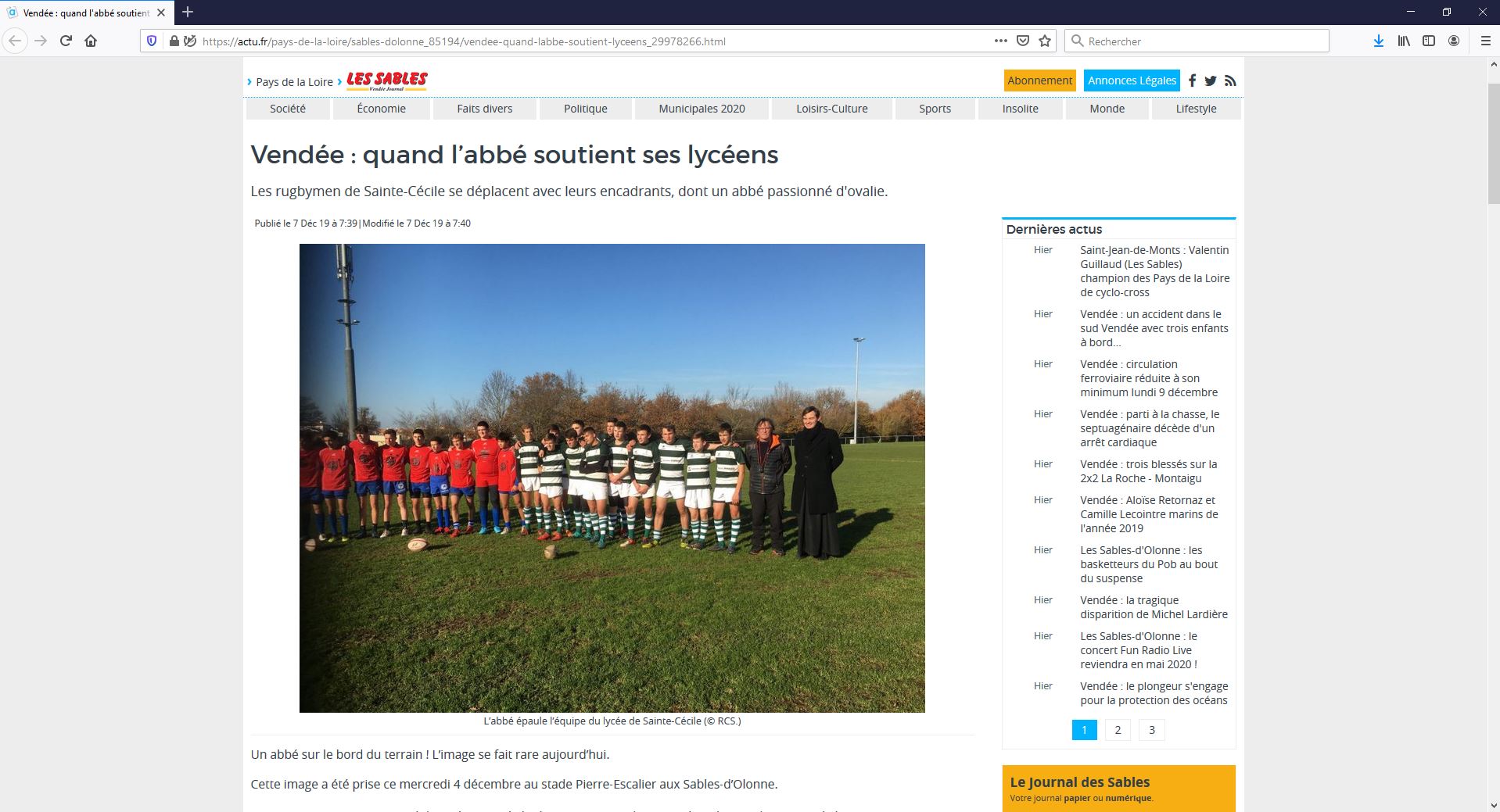Le journal en ligne Actu.fr dans son édition des Sables d’Olonne évoque le club de rugby de l’Ecole L’Espérance (Sainte-Cécile en Vendée) et de la présence sur les bords du terrain d’un prêtre (l’abbé Daniélou, FSSP) pour soutenir l’équipe de rugby du lycée.