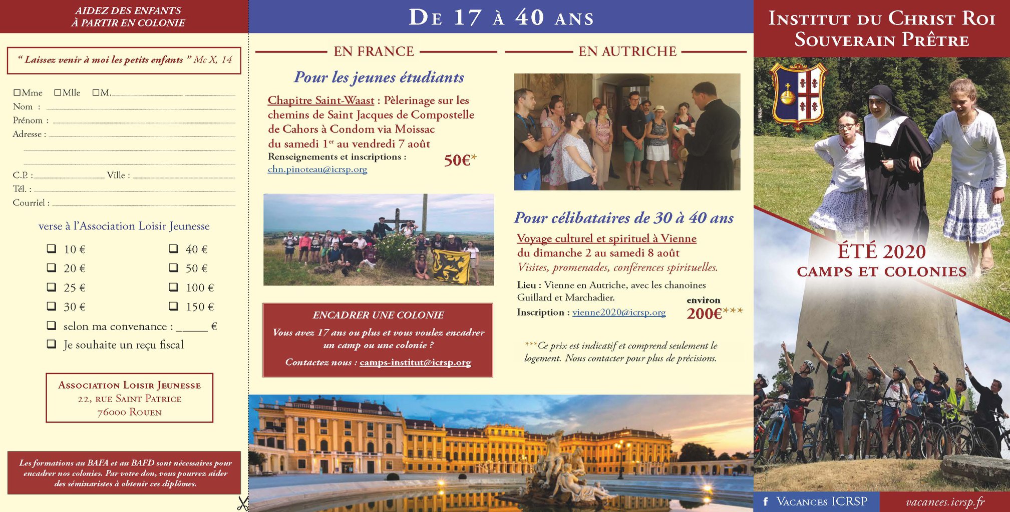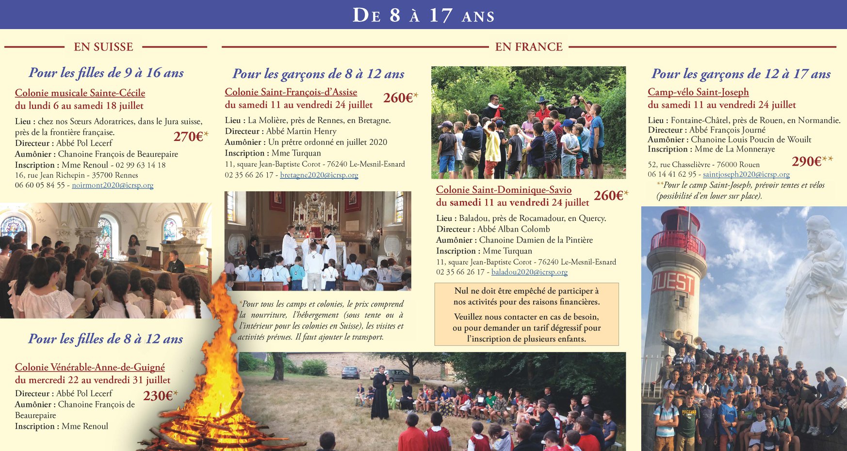 Comme chaque année, l’Institut du Christ Roi propose différents camps et colonies pour jeunes de 8 à 40 ans en juillet et août 2020. Ces camps sont souvent très demandés ne tardez pas à vous inscrire.