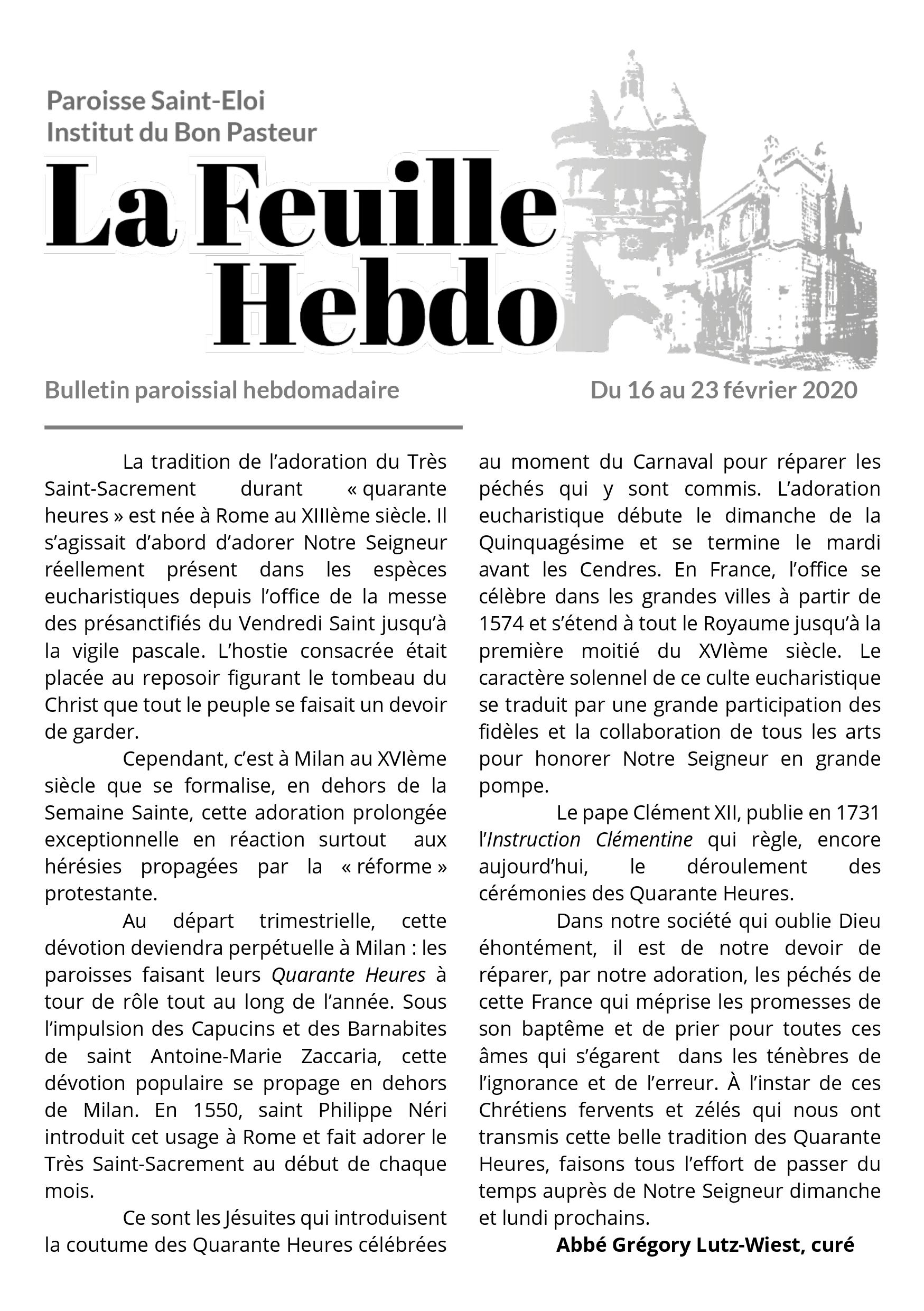 Le bulletin paroissiale de Saint-Eloi (Bordeaux) nous rappelle l’importance des Quarante heures, ce temps préparatoire au Carême célébrée encore aujourd’hui dans certaines paroisses.