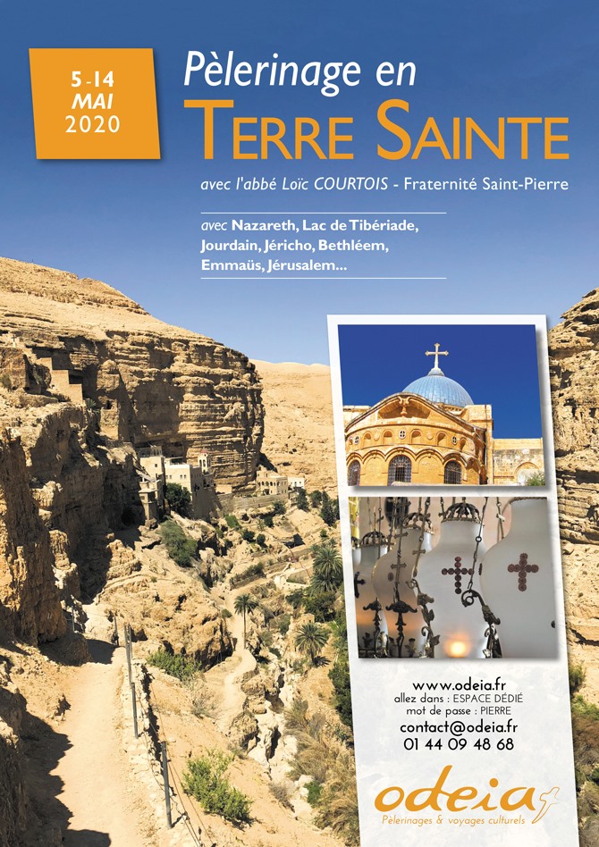 Accueil » Nos archives » Agenda: Pèlerinage en Terre-Sainte avec la Fraternité Saint-Pierre (Mai 2020) Summorum Pontificum Agenda: Pèlerinage en Terre-Sainte avec la Fraternité Saint-Pierre (Mai 2020) L’abbé Courtois, FSSP, accompagne comme les années passées un Pèlerinage en Terre-Sainte du 5 au 14 mai 2020 Agence Odéia (Programme et renseignements) Article précédentDécouvrez les adoratrices du Coeur Royal Article suivantLa démission du cardinal Barbarin acceptée par le pape 7 mars 2020