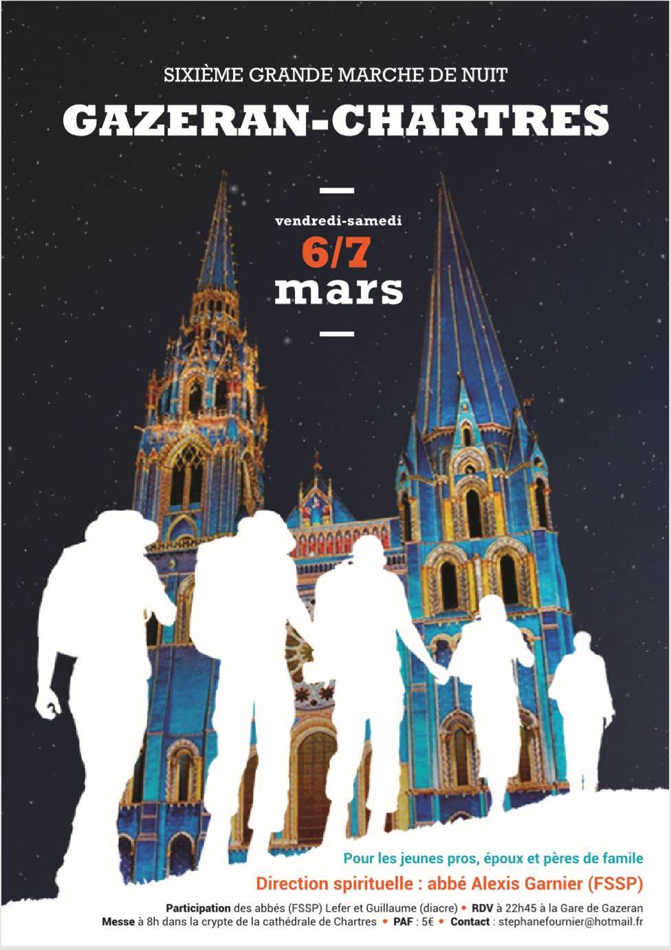 Un lecteur nous fait suivre cette proposition pour hommes : 6ème Grande Marche de Nuit vers Chartres (35 km) dans la nuit du vendredi 6 au samedi 7 mars.