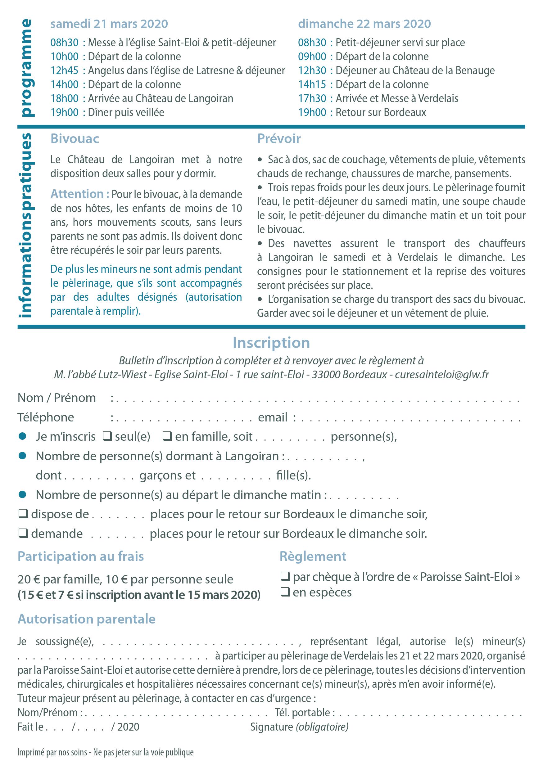 Accueil » Nos archives » Pèlerinage à Verdelais avec la paroisse Saint-Eloi (Bordeaux) Summorum Pontificum Pèlerinage à Verdelais avec la paroisse Saint-Eloi (Bordeaux) Comme les années passées, la Paroisse Saint-Eloi (Institut du Bon Pasteur) de Bordeaux vous convie à son pèlerinage à Notre-Dame de Verdelais les 21 et 22 mars. Paroisse Saint-Eloi (Bordeaux) Article précédentDe la communion spirituelle Article suivantBravo à Mgr Roland 2 mars 2020