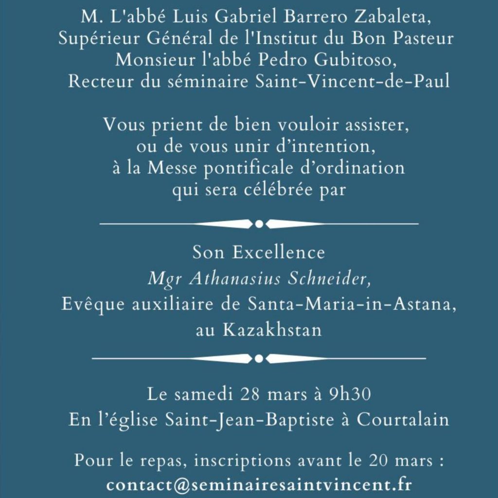 Accueil » Nos archives » Ordres mineurs et sous-diaconat à Courtalain le samedi 28 mars Summorum Pontificum Ordres mineurs et sous-diaconat à Courtalain le samedi 28 mars Mgr Schneider viendra conférer les ordres mineurs et ordonnés des sous-diacres pour l’Institut du Bon Pasteur au Séminaire Saint Vincent de Paul de Courtalain le samedi 28 mars. Article précédentMgr Aillet et le coronavirus Article suivantMesse pour les temps d'épidémie 12 mars 2020