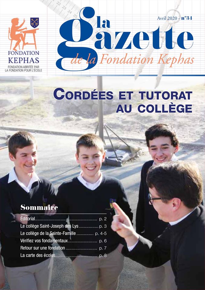 La dernière Gazette de la Fondation Kephas (N°34 avril 2020) vient de paraître avec : des collégiens qui rendent hommage aux soldats tués du Mali (Collège Saint Joseph des Lys, Versailles), cordées et tutorat au Collège de la Sainte-Famille (Grenoble) ainsi que le développement de l’Institut d’Argentré Sainte-Anne (Collège et lycée des filles à Sées).
