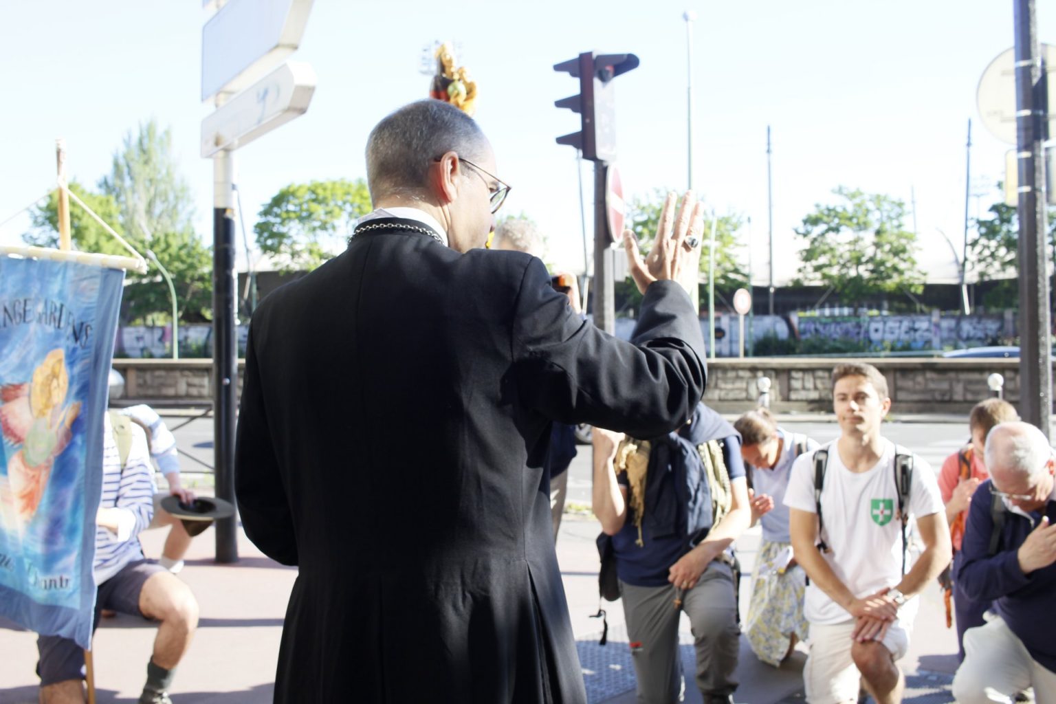Porte de Chatillon Mgr Rougé,évêque de Nanterre, a béni un petit groupe qui va se relayer vers Chartres en portant le statue de la Sainte-Vierge qui ouvre chaque année la marche des pèlerins