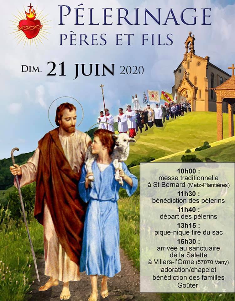 Un lecteur nous invite à diffuser cette annonce pour le Pèlerinage Pères et Fils organisé par la communauté traditionnelle de Metz. Rappelons que la messe dans la forme extraordinaire est célébrée les dimanches et fêtes (hors grandes vacances scolaires) à 10h00 en l’église Saint-Bernard des Plantières à Metz.