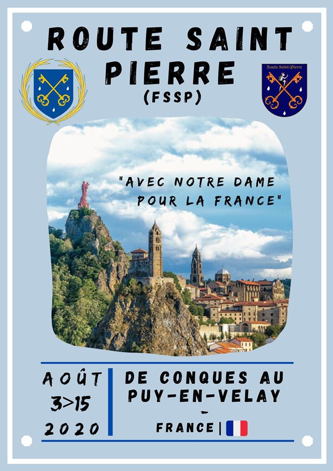 La Route Saint-Pierre s’adresse aux jeunes et garçons de 18 à 28 ans et se déroulera du 3 au 15 août. Mais devant les circonstances actuelles, la destination est modifiée : la Route se fera en France : De Conques au Puy-en-Velay, à la découverte des grands sanctuaires et des magnifiques paysages de notre pays ! Le rendez-vous est donné le 3 août à Rodez et l’arrivée le 15 août au Puy-en-Velay. Chaque journée de marche équivaut à 15-25 km par jour ! Sans demander un grand effort physique, cela suppose tout de même d’être en condition physique et équipé pour marcher. La direction et l’aumônerie est assurée par des prêtres et séminaristes de la Fraternité Saint-Pierre.