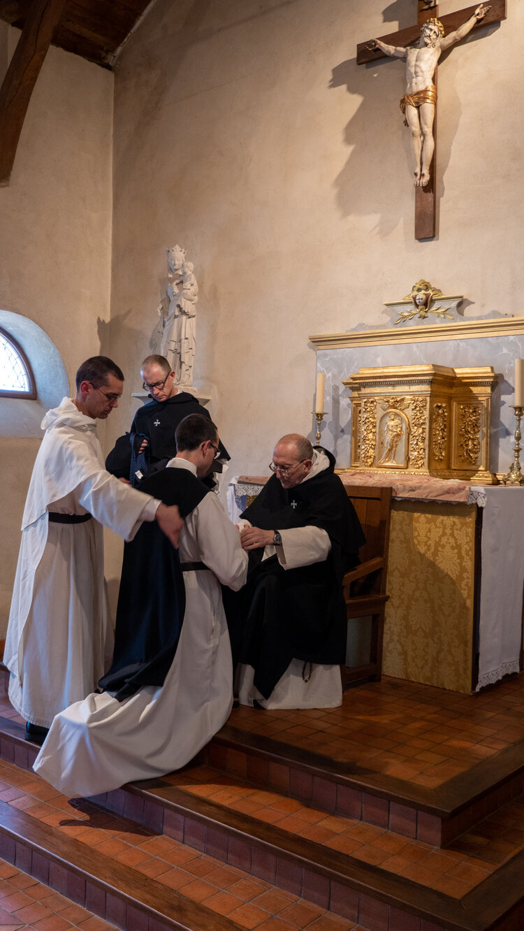 Suit l’émouvante cérémonie par laquelle il quitte les vêtements du siècle pour revêtir l’habit de ceux qui veulent suivre le Christ de plus près, dans les pas de saint Dominique. Il a choisi le scapulaire noir des convers, signe d’une vie de service et d’humilité. Désormais on l’appellera frère Simon, sous le patronage du bienheureux Simon Ballachi, convers dominicain mort en 1319 à Rimini.