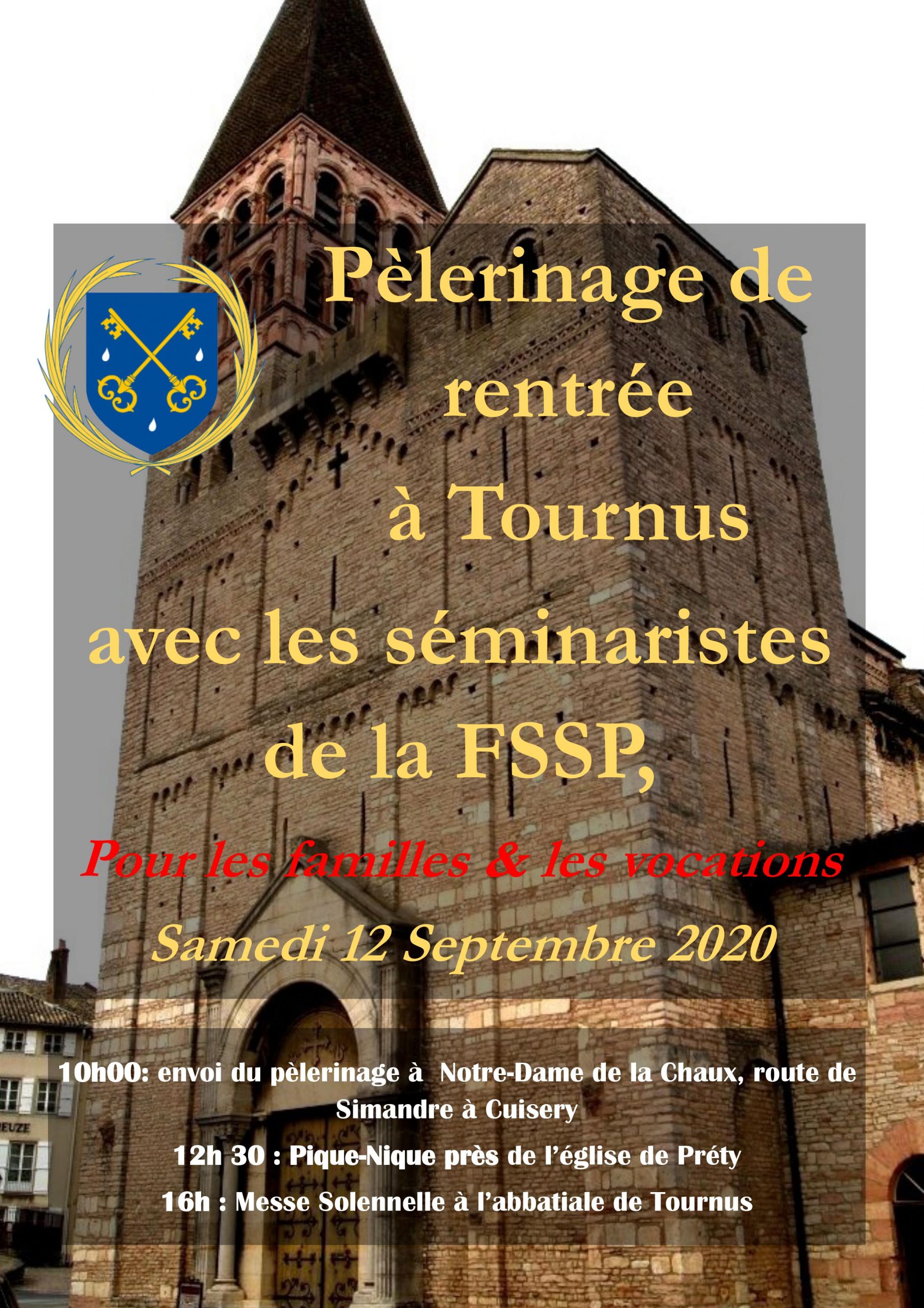 Le samedi 12 septembre aura lieu le Pèlerinage de rentrée pour les familles et les vocations avec le Séminaire Saint-Pierre (Wigratzbad) à Tournus. L’envoi sera fait de Notre-Dame de la Chaux (Cuisery – 71) à 10h. Le déjeuner aura lieu à Préty (71). La messe solennelle de clôture sera célébrée en l’Abbatiale Saint-Philibert de Tournus (71) par l’abbé Vincent Ribeton, recteur du Séminaire. La marche est d’une quinzaine de kilomètres.