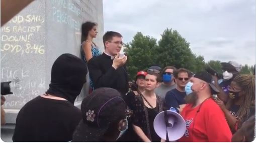 Parmi les contre-manifestants, l’abbé Stephen Schumacher, simple prêtre du diocèse de Saint-Louis ordonné en 2019, s’est longuement adressé à une foule qui criait, tentant de les informer de la vie de Saint Louis, en disant : « Saint Louis était un homme qui voulait utiliser sa royauté pour faire du bien aux gens ».