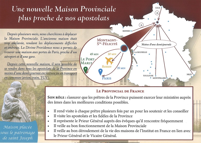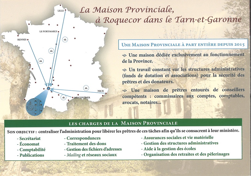 Depuis 2015, la Maison Provinciale de l’Institut du Christ Roi Souverain Prêtre en France est basée à Roquecor (60 km au nord-ouest de Montauban) dans le Tarn-et-Garonne. La maison Saint Louis offrait tous les avantages pour la gestion administrative de la Province de l’Institut qui compte aujourd’hui 35 chanoines, une présence de 27 diocèses français et une quarantaine de lieux de messes, mais son éloignement géographique d’une partie des apostolats de l’Institut rendait les déplacements difficiles et plus longs.