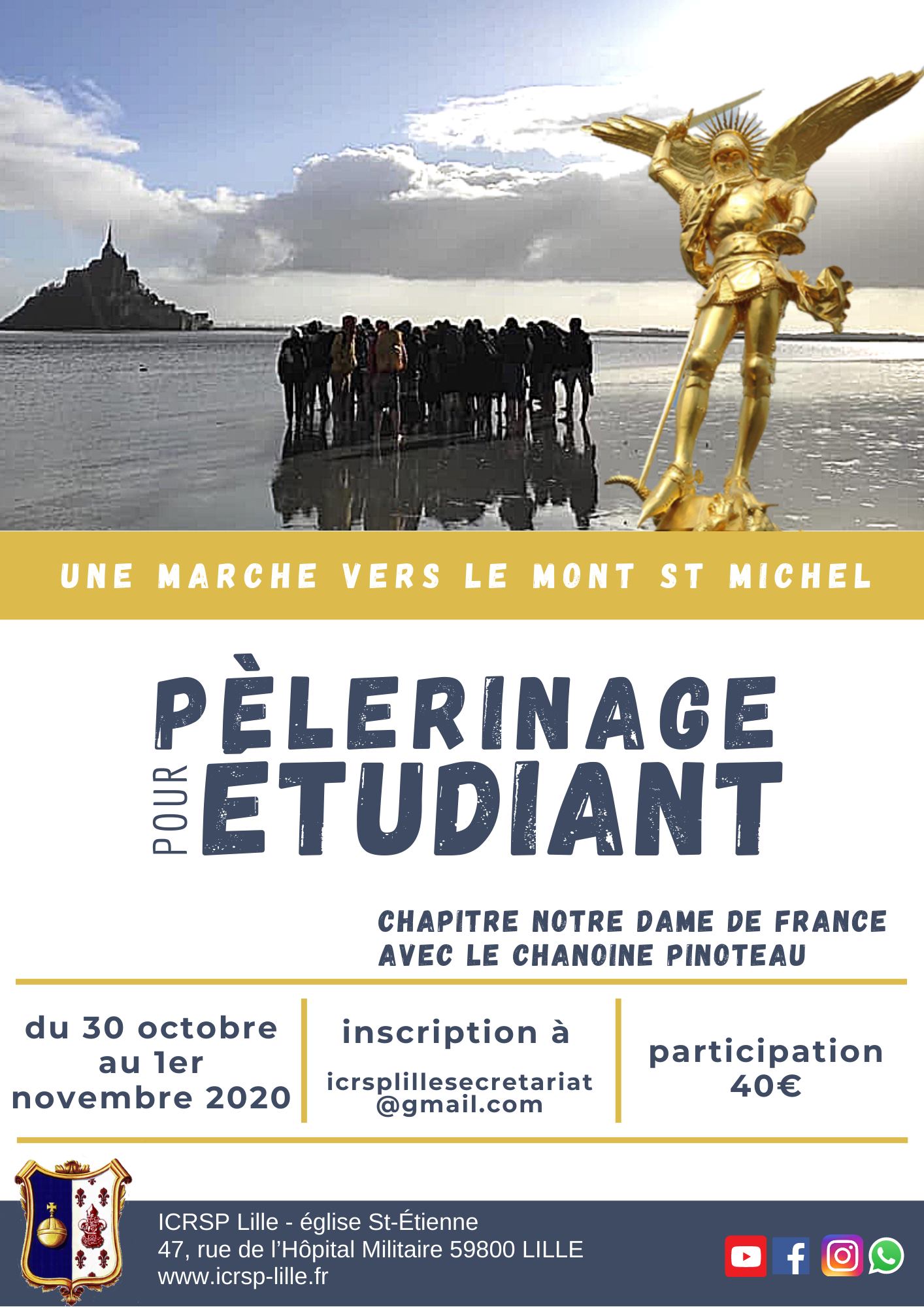 Comme l’an passé, un pèlerinage étudiants est organisé au Mont Saint Michel du 30 octobre au 1er novembre accompagné par le chanoine Pinoteau, ICRSP (Lille). Covoiturage depuis Lille et Paris.