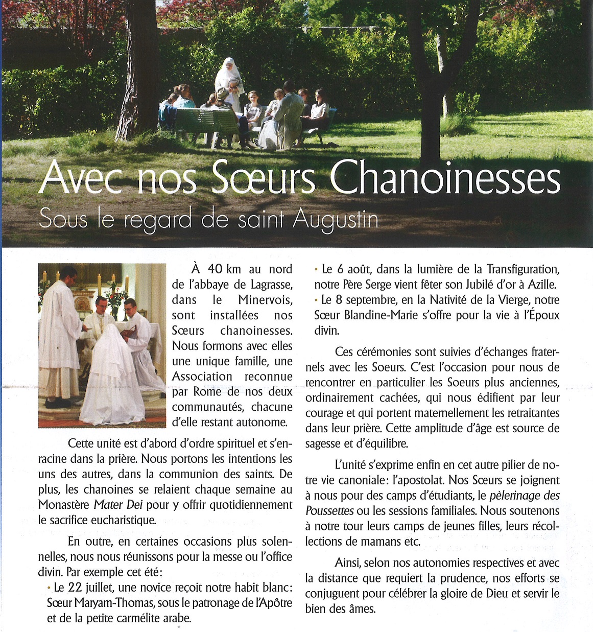 La famille canoniale de la Mère de Dieu rassemble les chanoines (Abbaye Sainte-Marie de Lagrasse) d’une part et les chanoinesses (Monastère Mater Dei d’Azille) d’autre part. Ces deux communautés religieuses tirent leur spiritualité de Saint-Augustin. Les Chanoinesses de la Mère de Dieu sont installées dans l’ancien monastère des Clarisses à Azille (à 40 km de l’abbaye de Lagrasse).