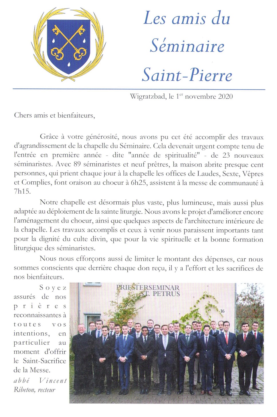 Le Séminaire Saint-Pierre publie une lettre, les Amis du Séminaire Saint-Pierre, dont nous vous proposons l’éditorial de celle de novembre de l’abbé Vincent Ribeton, FSSP, recteur :