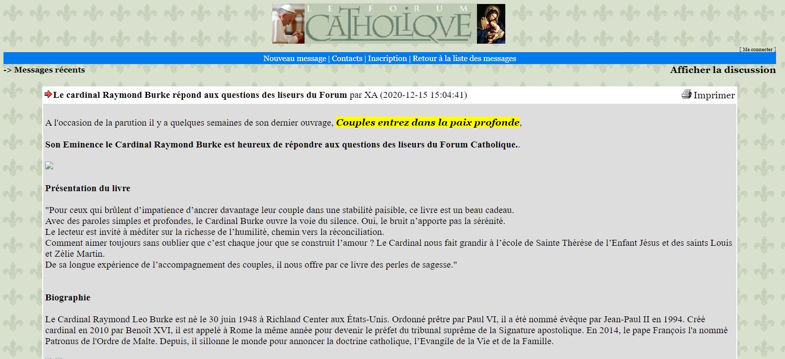 Le Cardinal Burke, préfet émérite du Tribunal de la Signature Apostolique et Patronus de l’Ordre de Malte répondra, aux questions des liseurs (lecteurs du Forum Catholique) dans le cadre des rendez-vous du Forum Catholique. Ce forum de discussion a été lancé en 2000, il contribue à faire échanger les fidèles entre eux sur tous sujets liées à la foi catholique en général et à la tradition en particulier. Il est nécessaire de s’inscrire pour intervenir.