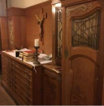 Au moment où nous écrivons ces lignes, nous préparons l’arrivée d’une généreuse donation de matériel d’église et de sacristie, y compris des bancs et un harmonium, provenant d’une chapelle d’hôpital désaffectée en Allemagne. Nous sommes profondément reconnaissants au donateur et à tous ceux qui ont contribué aux coûts du transport et d’installation. Le déménagement de la sacristie depuis le fond de l’église jusqu’à son nouvel emplacement libérera beaucoup plus d’espace pour les fidèles. Ce don demandait le nettoyage de la grande salle à côté de l’église qui servira de sacristie. Ce faisant, nous avons découvert de nombreux trésors, dont de la ferronnerie architecturale, parfois très ancienne, (que nous espérons pouvoir restaurer et utiliser) et, mieux encore, un ancien tabernacle et son pélican. Probablement c’était celui ici avant la Révolution.