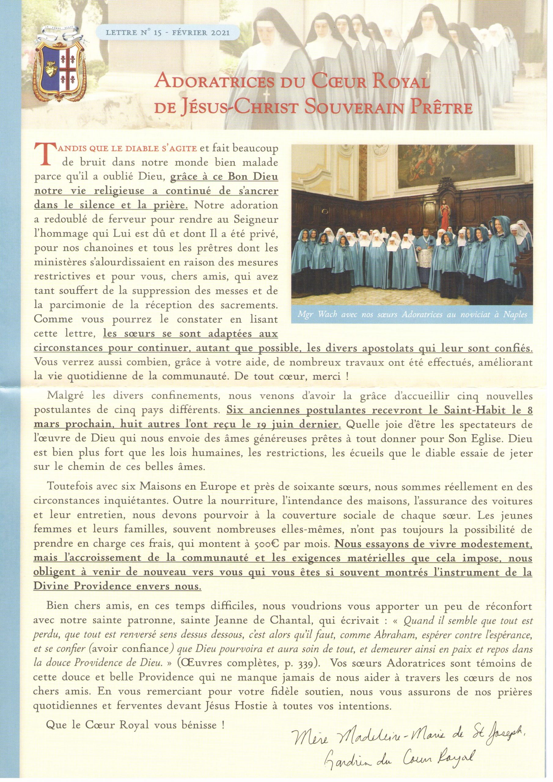 Fondée en 2001, la communauté compte désormais une soixantaine de soeurs dans 7 maisons (6 en Europe et 1 aux Etats-Unis). Les Soeurs sollicitent votre soutien pour les aider à accueillir les nombreuses vocations qui se présentent.