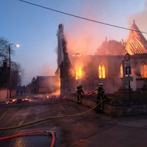 L’église Saint-Pierre de Romilly la Puthenaye a été complètement détruite vers six heures du matin ce samedi 17 avril après que le clocher et la charpente se soient embrasés. Le feu pourrait être parti du moteur des cloches et avoir couvé toute la nuit.