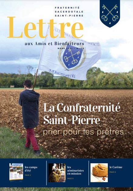 Dans la lettre aux Amis et Bienfaiteurs de la Fraternité Saint-Pierre (n°106, Mars 2021), l’abbé Hubert Bizard, FSSP, présente la Confraternité Saint-Pierre, oeuvre de soutien du ministère des prêtres de la Fraternité-Saint-Pierre par la prière.