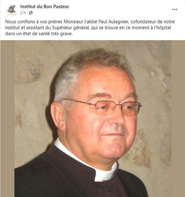 Accueil » Nos archives » Vos prières pour l’abbé Paul Aulagnier Summorum Pontificum Vos prières pour l’abbé Paul Aulagnier La page facebook de l’Institut du Bon Pasteur nous invite ce jeudi soir à prier et faire prier pour l’abbé Paul Aulagnier, IBP, qui est à nouveau hospitalisé dans un état très grave. Article précédentBarneville-Carteret (Manche) : désaffection de l’église de Carteret, celle de Barneville restaurée Article suivantQuand les diocèses de Bordeaux et d’Auch finançaient les mosquées 22 avril 2021