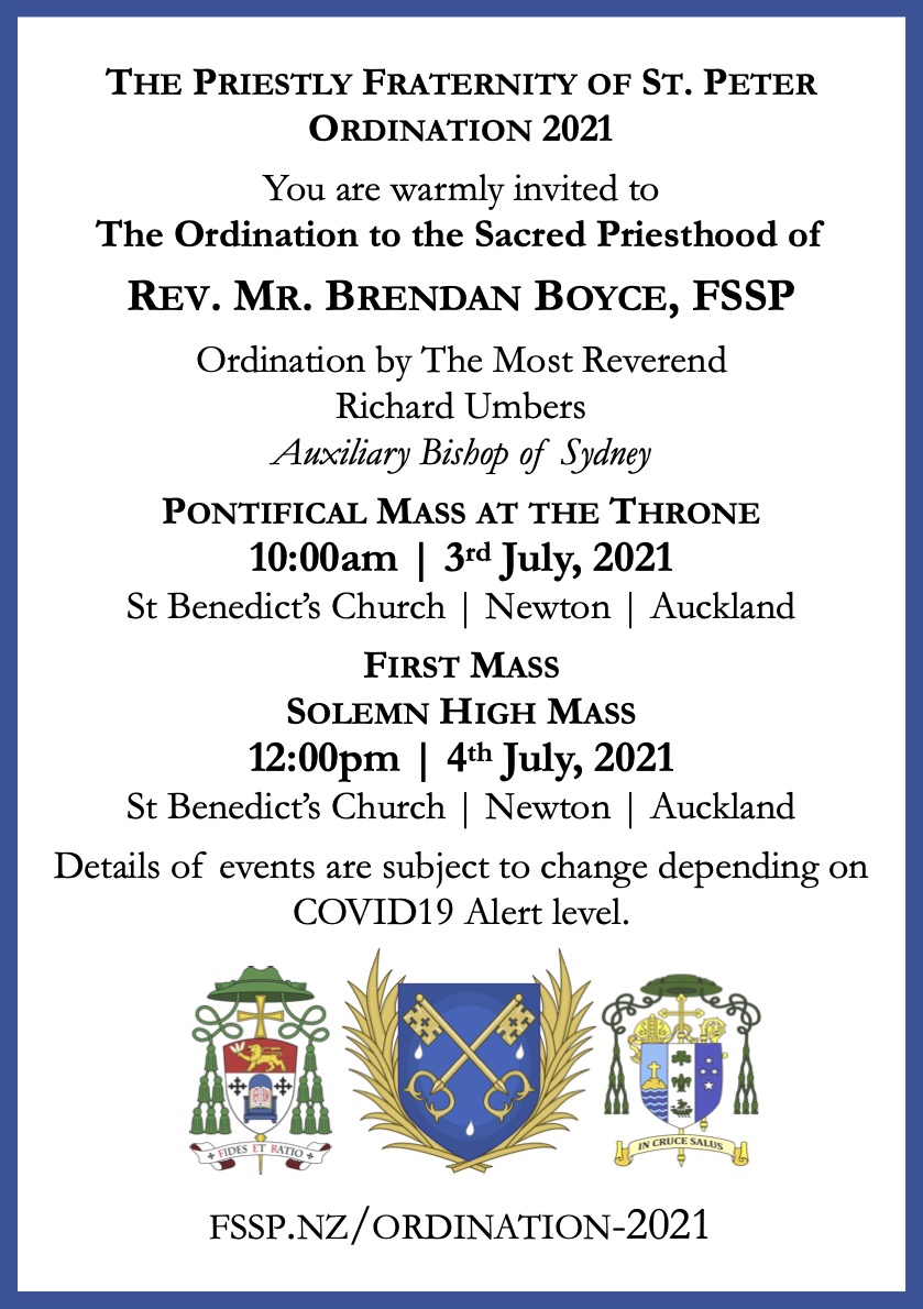 Le samedi 3 juillet, Mgr Richard Umbers, évêque auxilliaire de Sydney (Australie) ordonnera prêtre pour la Fraternité Saint-Pierre l’abbé Brendan Boyce, FSSP en l’église Saint Benoît de Newton-Auckland.