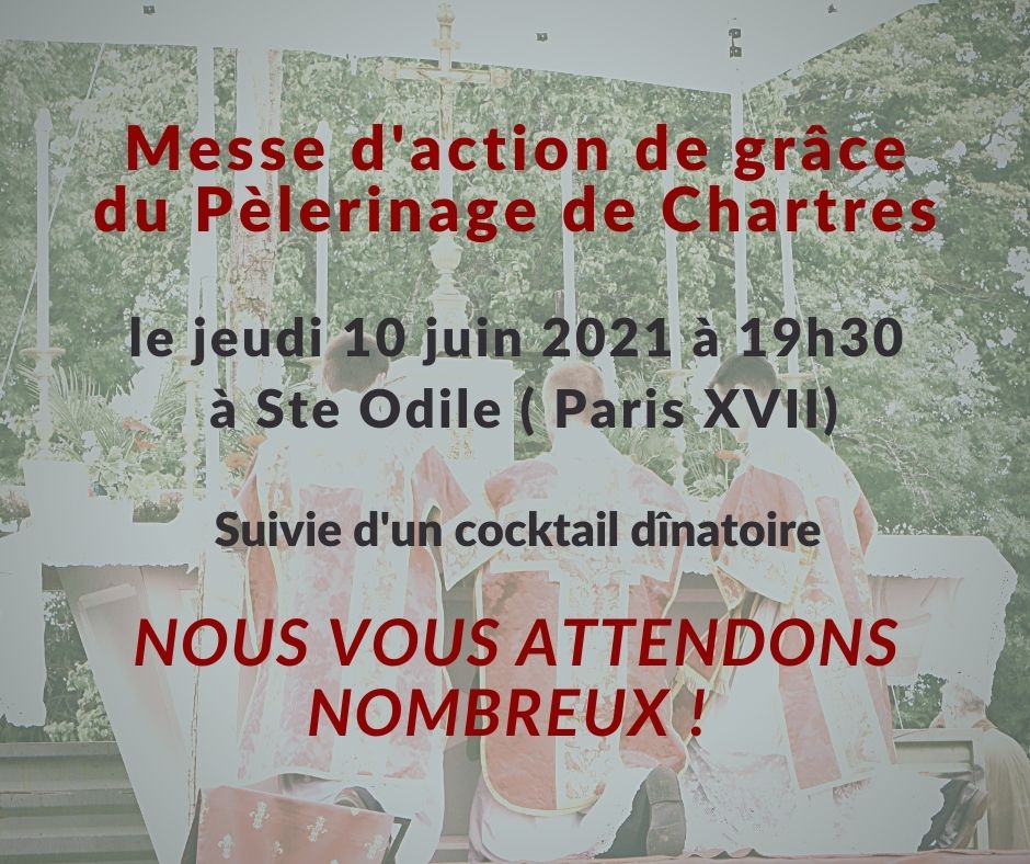 Comme chaque année, la messe d’action de grâce du Pèlerinage de Pentecôte vers Chartres aura lieu le jeudi 10 juin 2021 à 19h30 à l’église Sainte-Odile de Paris. La messe a été décalée d’une semaine en raison de l’horaire du couvre-feu (couvre-feu 23h à partir du 9 juin).