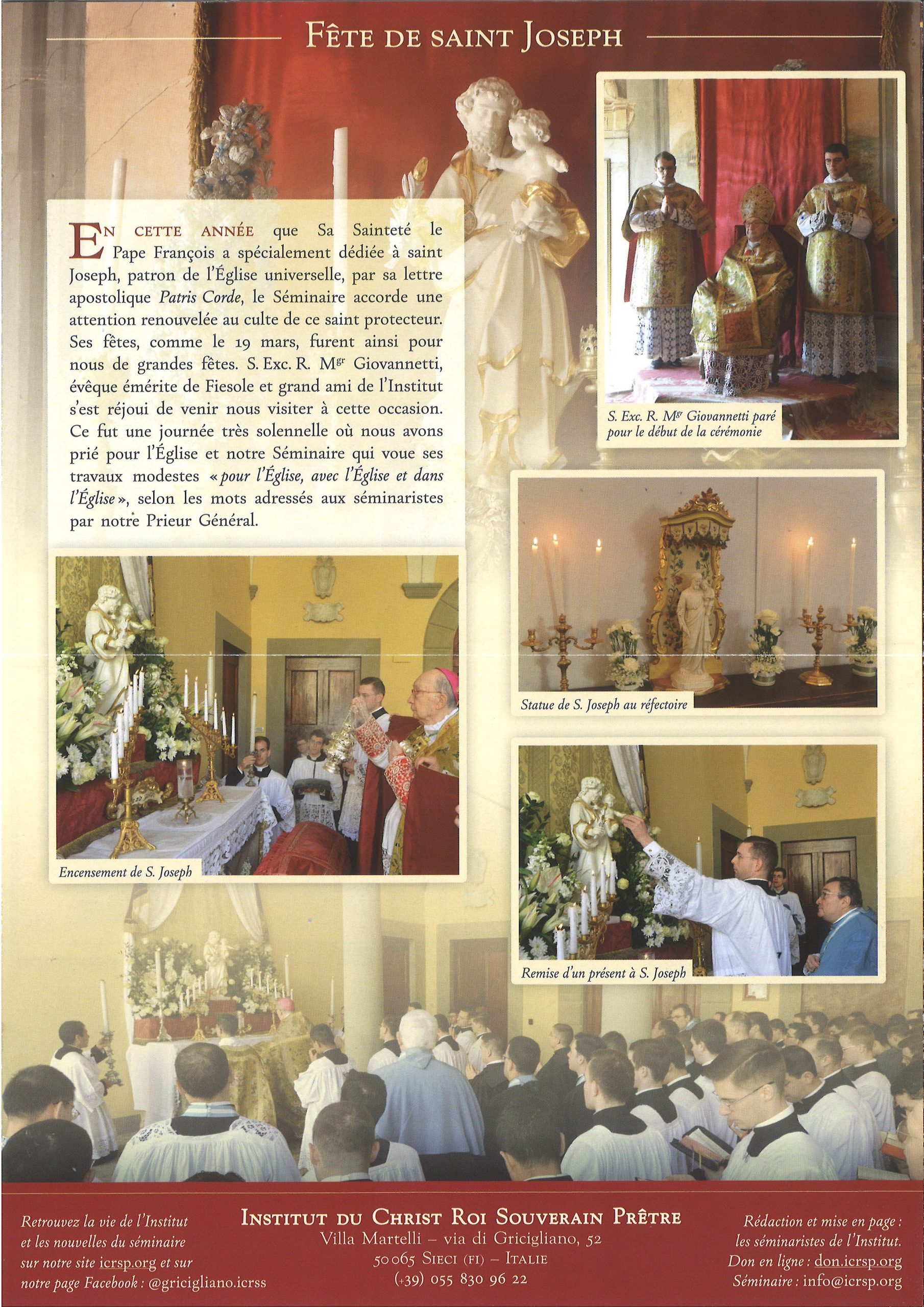 Comme chaque année, les prêtres nouvellement ordonnés de de l’Institut du Christ Roi signent la lettre aux Amis et Bienfaiteurs du Séminaire Saint-Philippe Néri. Cette lettre revient également sur la Semaine Sainte au Séminaire de Gricigliano et la fête de Saint Joseph :