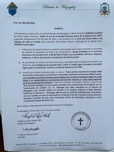 Notre confrère Messa in Latino évoque le cas du diocèse de Mayagüez (Porto Rico) où l’évêque du diocèse publie un décret le 17 juillet (lendemain de la publication du Motu Proprio) indiquant que l’absence de demande de célébrations dans la liturgie traditionnelle, il l’interdisait sur son territoire diocèse (Ouest de Puerto-Rico) :