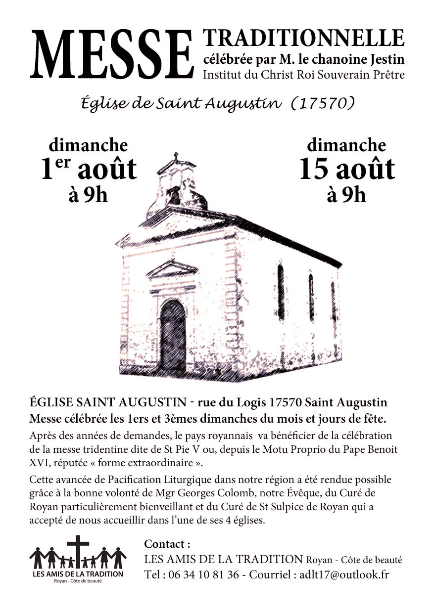 Messe traditionnelle près de Royan (Charente-Maritime) à compter du 1er août prochain et tous les 1ers et 3èmes dimanches de chaque mois. Elle sera célébrée par M. le chanoine Jestin (ICRSP) à 9 heures dans l’église de Saint-Augustin (10 km du centre de Royan, 8 km de Pontaillac)