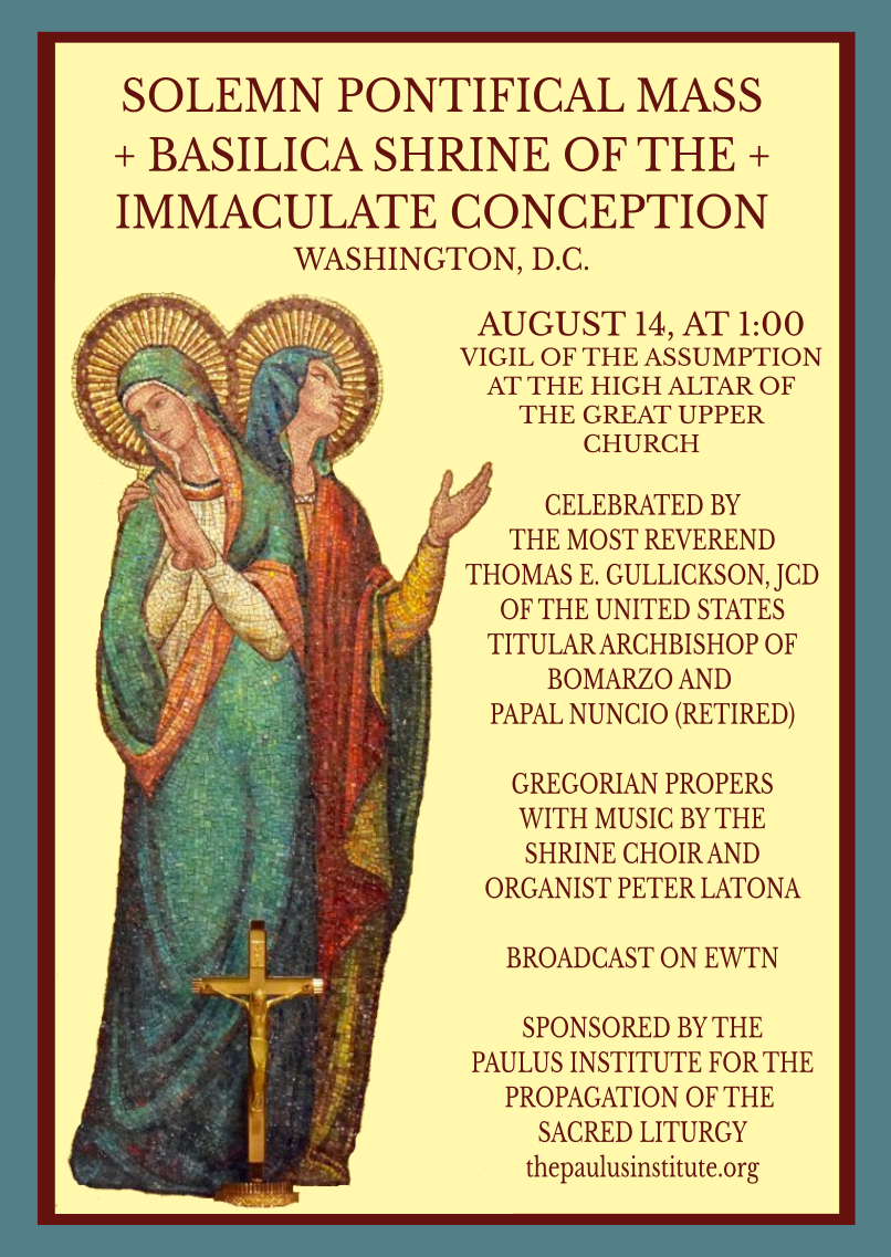 Notre confrère anglophone Rorate Caeli indique que la messe pontificale qui devait être célébrée le 14 août au Sanctuaire national de l’Immaculée Conception à Washington (USA) est annulée par décision de l’archevêque. Cette messe organisée par l’Institut Paulus pour la propagation de la liturgie sacrée rassemblait chaque année plusieurs centaines de personnes. Le célébrant était Mgr Gullickson, nonce apostolique émérite en Suisse.