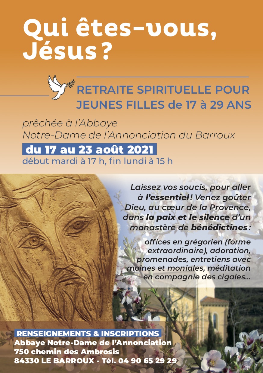 Comme chaque été, les bénédictines du Barroux proposent une retraite spirituelle pour jeunes filles de 17 à 29 ans, prêchée à l’Abbaye Notre-Dame de l’Annonciation du 17 au 23 août 2021 : Conférences, offices en grégorien (messe traditionnelle), promenades, entretiens avec moines et moniales…