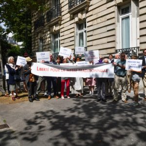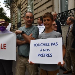 Ce samedi 31 juillet, pour la troisième semaine consécutive, de 12 à 13 heures, plus de 50 catholiques de tous âges et de toutes conditions se sont réunis, 10 avenue du Président Wilson à Paris, devant la nonciature apostolique en France, avec un fort taux de renouvellement par rapport à la manifestation de la semaine précédente.