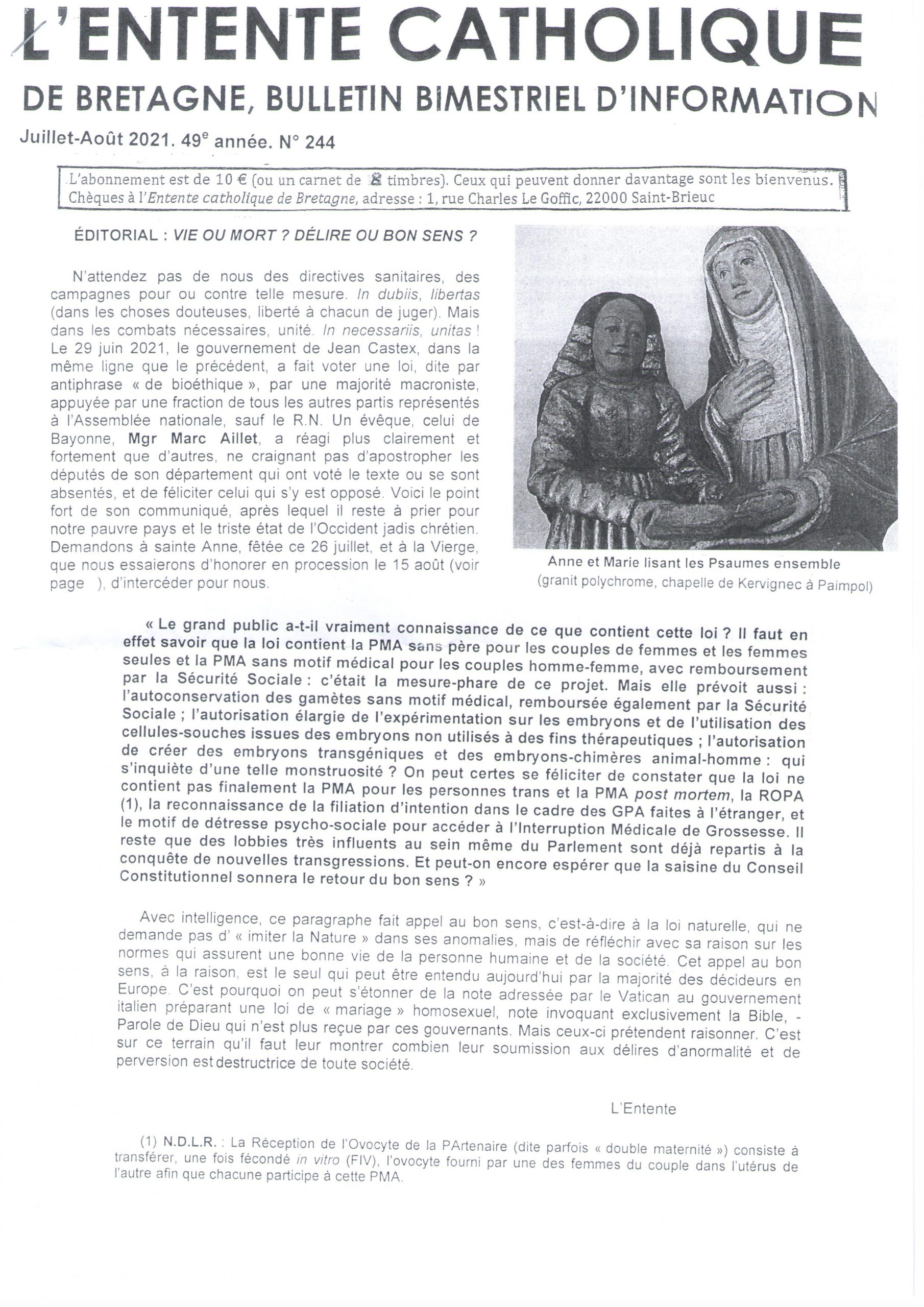 L’Entente Catholique de Bretagne – 1 rue Charles Le Goffic – 22000 Saint-Brieuc (Abonnement de 10€)