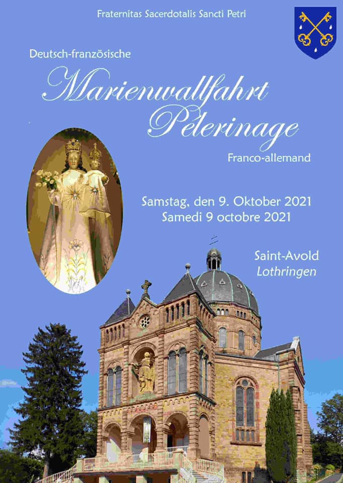 Comme les années passés, les fidèles de la communautés traditionnelle de Saarlouis (Allemagne) pèlerineront à la Basilique Notre-Dame de Bon Secours de Saint-Avold le samedi 9 octobre. Ils seront rejoints par des fidèles du diocèses de Metz. Saint Avold est à la frontière allemande à une cinquantaine de kilomètres à l’est de Metz.