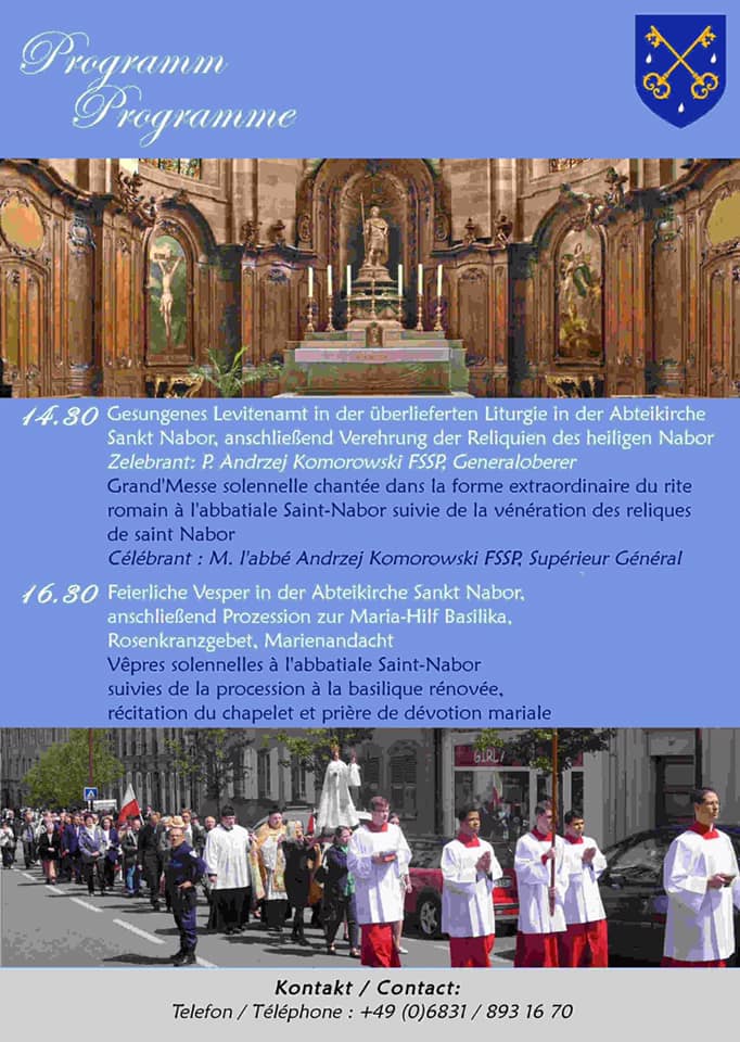 La messe sera célébrée par l’abbé Komorowski, Supérieur Général de la Fraternité Saint-Pierre, et sera suivi des Vêpres.