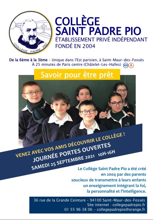 Un lecteur nous invite à diffuser la date de la prochaine journée portes ouvertes du Collège Saint-Padre Pio (Saint-Maur des Fossés) le samedi 25 septembre. Ce collège indépendant est basé dans l’est parisien et l’aumônerie est assurée par les prêtres de la Fraternité Saint-Thomas Becket.