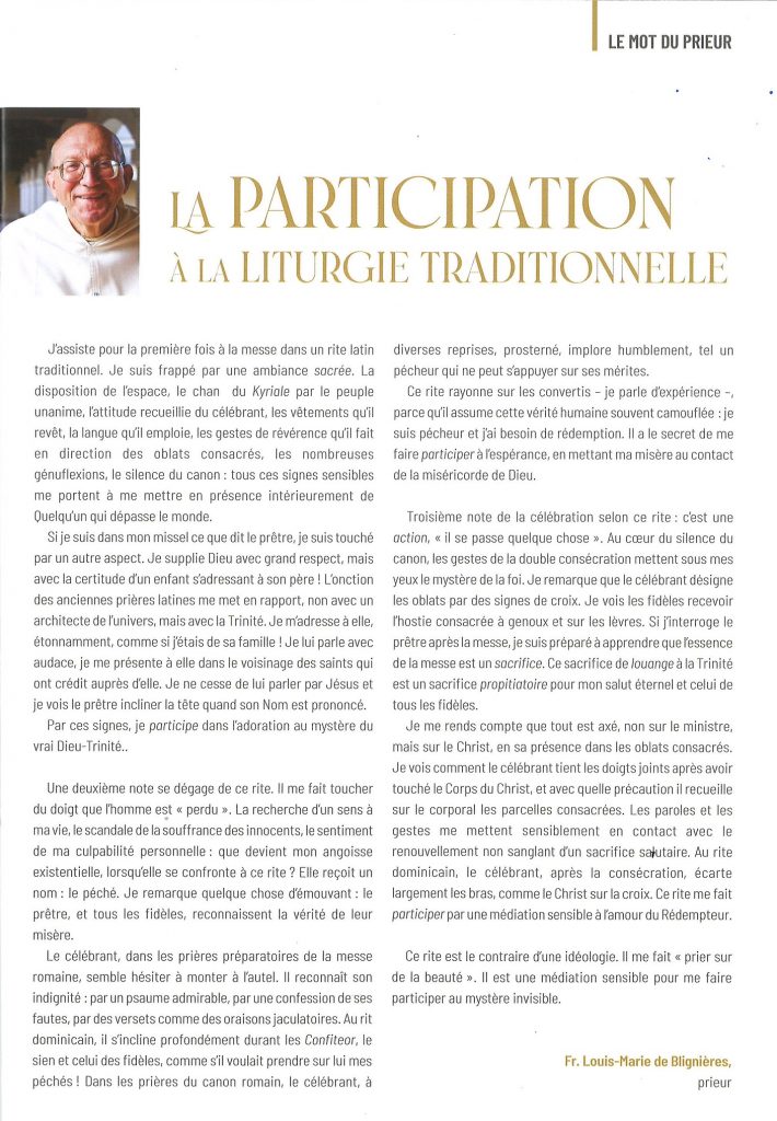 On lira avec intérêt l’éditorial du RP Louis-Marie de Blignières, fondateur et prieur de la Fraternité.