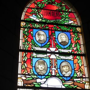 Dans la nef, dix verrières en effet rappellent la mémoire des soldats du village morts sur les champs de bataille de la première guerre mondiale, de l’Yser à l’Orient en passant par la Somme, l’Aisne ou la Marne. Trente-quatre des soixante morts de la commune sont gravés pour l’éternité sur de touchantes et vivantes verrières que nous devons au maître-verrier parisien Gabriel Léglise, qui les réalisa en 1921 et les fit poser début 1922.