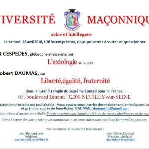 Le 20 avril 2018 dans le cadre de l’Université Maçonnique Vincent Cespedes donne une conférence sur l’axiologie – le domaine des valeurs morales – au grand Temple [maçonnique] du Suprême Conseil pour la France, boulevard Bineau à Neuilly. L’entrée est « réservée aux frères et soeurs de toutes obédiences et tous grades« , autrement dit aux franc-maçons, quel que soit leur degré d’initiation et leur loge.