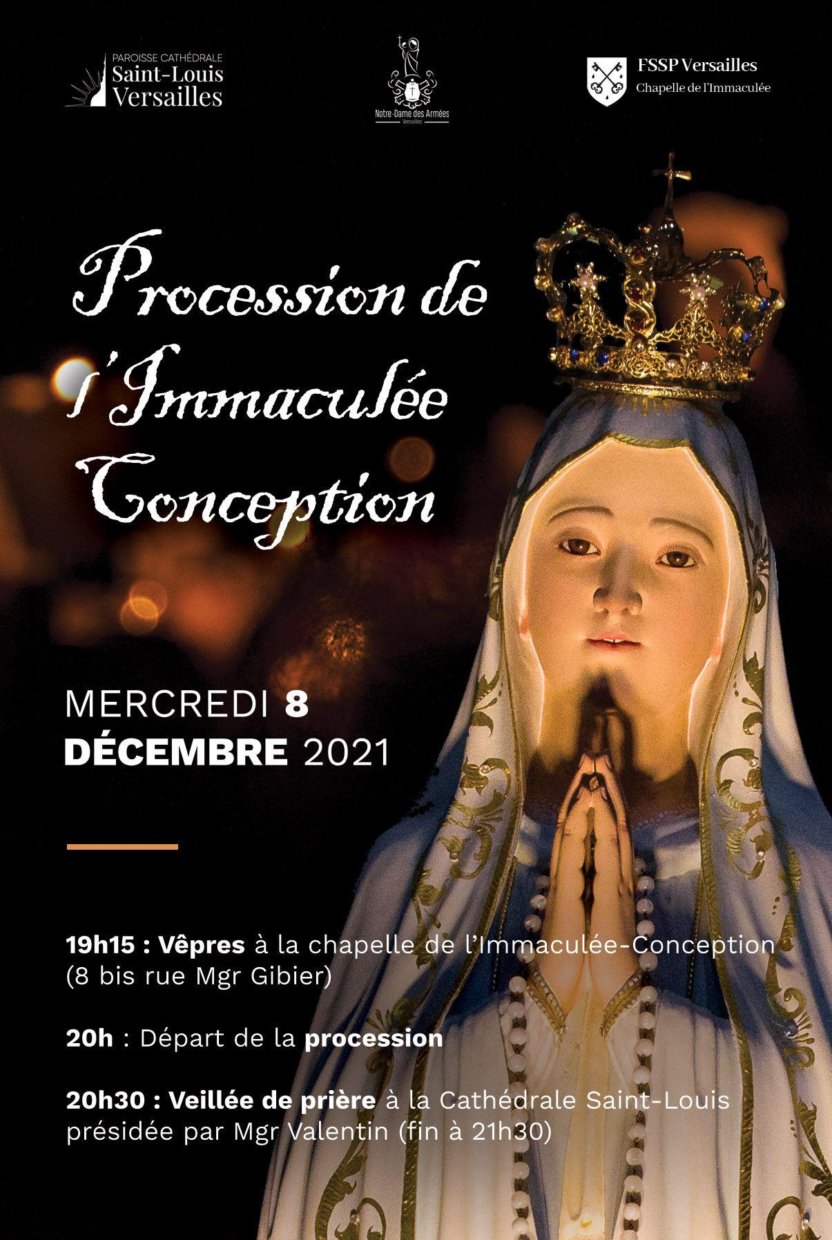 La Cathédrale Saint-Louis, la paroisse Notre-Dame des Armées et la Chapelle de l’Immaculée Conception de Versailles vous invitent à la procession de l’Immaculée Conception : de la chapelle de l’Immaculée Conception à la cathédrale le mercredi 8 décembre.