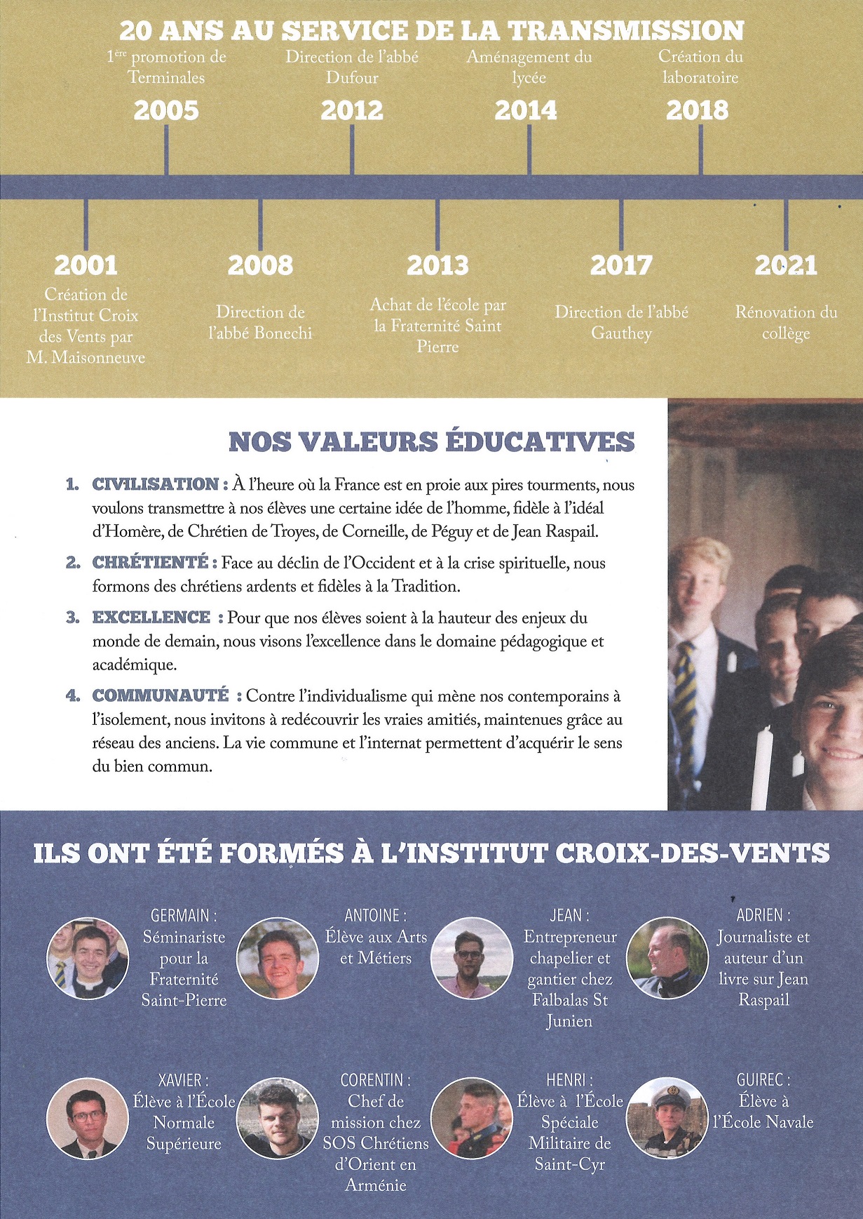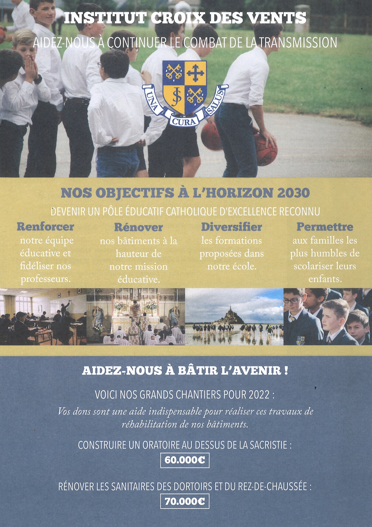 Créée en 2001, l’Institut Croix des Vents n’a cessé de se développer : il compte plus de 200 élèves, une vingtaine de professeurs laïcs et 7 prêtres présents en permanence (Fraternité Saint-Pierre). En cette fin d’année, l’Institut Croix des Vents (Sées) sollicite notre soutien pour de nouveaux travaux : construction un oratoire et des sanitaires à rénover.