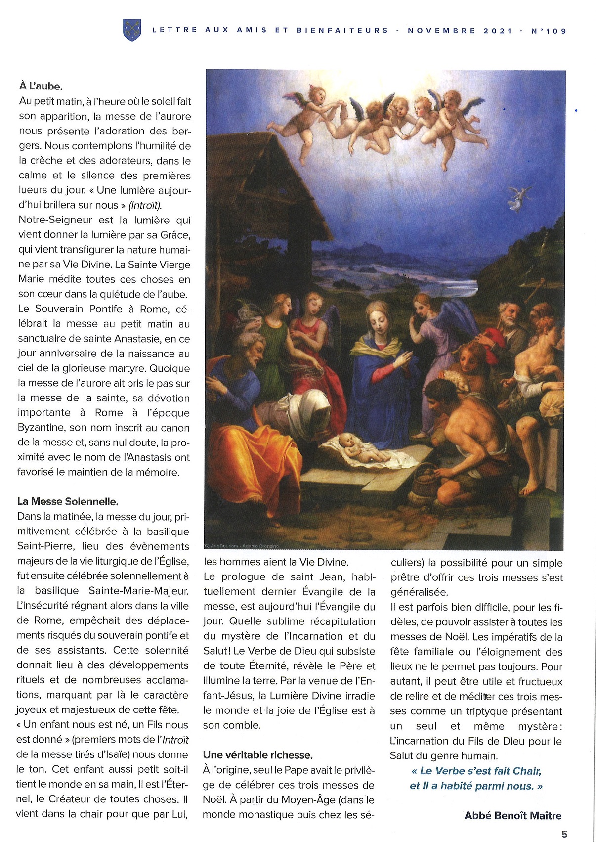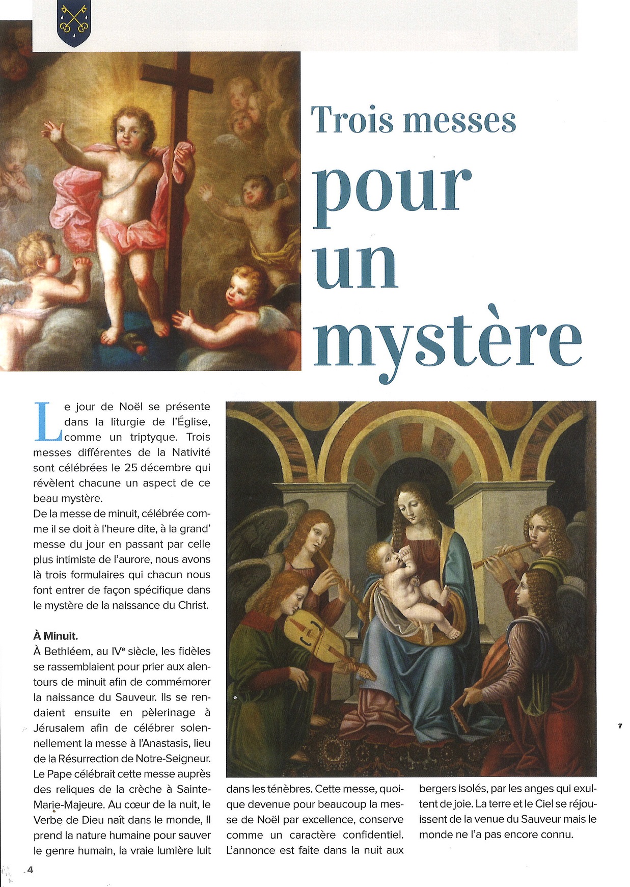 Dans le dernier numéro de la Lettre aux Amis et Bienfaiteurs de la Fraternité Saint-Pierre, l’abbé Benoît Maître, FSSP, évoque les 3 messes de Noël (Messes de Minuit, de l’Aurore et du jour) et nous rappelle fort à propos : « Il peut être utile et fructueux de relire et de méditer ces trois messes comme un triptyque présentant un seul et même mystère : l’Incarnation du Fils de Dieu pour le Salut du genre humain«