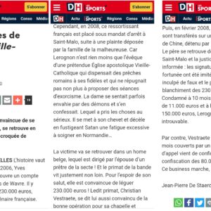 Par ailleurs le « primat » autoproclamé de cette église, le belge Christian Verstraete, a été jugé en Belgique dans une affaire où une fidèle de la région de Saint-Malo, approchée par un « évêque » autoproclamé, Mgr Albéric (Yves Lerognon à l’état civil) a été transférée en Belgique dans une maison de retraite gérée par une proche d’un soi-disant « prêtre » de cette fausse église et où un chèque avec une signature falsifiée de cette fidèle a été fait au soi-disant évêque pour 230.000 euros.