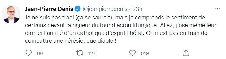 Jean-Pierre Denis est journaliste et ancien directeur de l’hebdomadaire « La Vie ». Il est aujourd’hui directeur du développement éditorial au sein du groupe Bayard. Comme il l’indique lui même, la tradition liturgique n’est pas du tout sa tasse de thé… mais il formule sur le réseau Twitter ce 27 décembre une certaine incompréhension des mesures romaines.