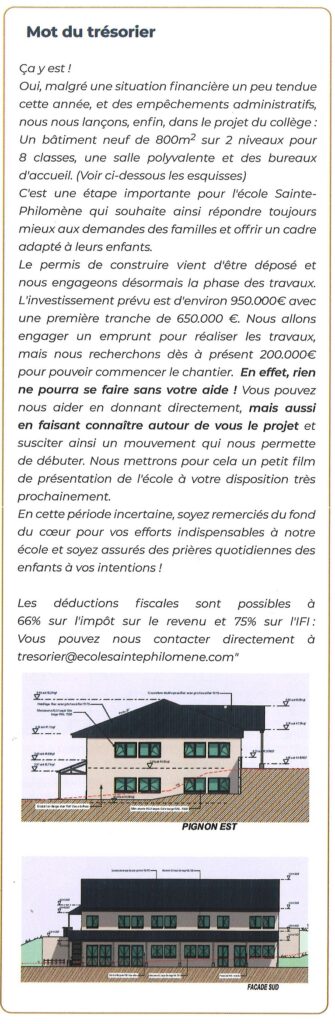 L’école Sainte Philomène a été fondée par un groupe de parents en 2003. Elle compte aujourd’hui plus de 200 élèves de la maternelle à la 3è. L’école est accompagnée par un prêtre de l’Institut du Christ Roi. L’Ecole souhaite construire un nouveau bâtiment pour y mettre 8 classes , une salle polyvalente et des bureaux administratifs.