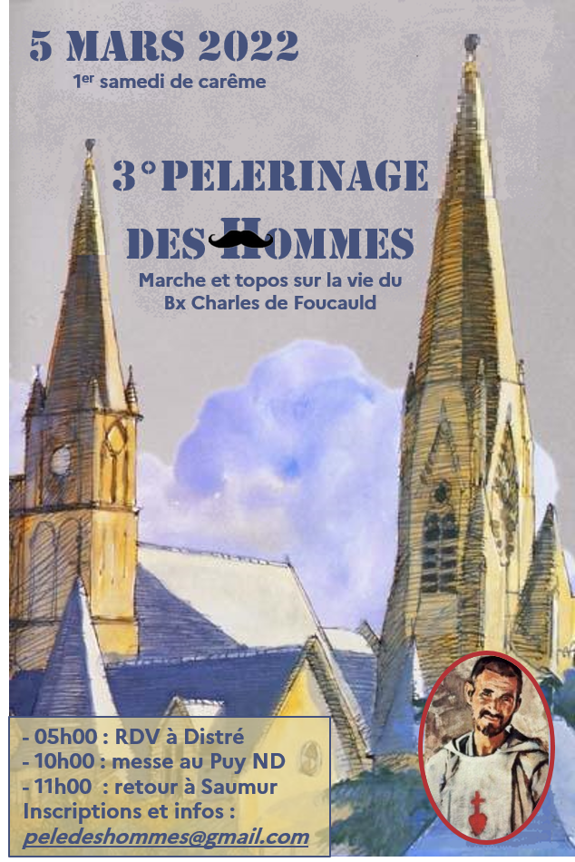Accueil » Nos archives » Agenda: Pèlerinage pour hommes à Saumur le 5 mars Summorum Pontificum Agenda: Pèlerinage pour hommes à Saumur le 5 mars Le 3ème Pèlerinage pour hommes aura le samedi 5 mars de Distré (49) à Saumur (49). Il est accompagné par les prêtres de la Fraternité Saint-Thomas Becket. Association Saint-Florent d’Anjou (Saumur) Article précédentFace à une grossesse non désirée, l'accueil de la vie pourrait être mieux organisé par l'État Article suivantLes rencontres avec les musulmans c'est mieux en visioconférence 9 février 2022