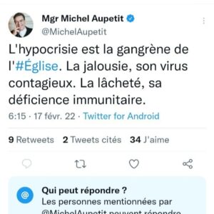 Pour moi Mgr Aupetit est toujours quelqu’un de bien … son tort est de s’être appuyé sur une planche pourrie appelé « François »! . Ou dit plus bibliquement, d’avoir appuyé sa main sur un roseau fêlé qui perce la main qui s’y appuie… (Isaîe chap. XII)